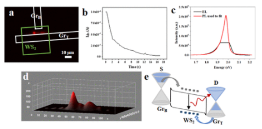 T結構的EL表征。(a) 紅色發射的光學圖像。白色方框代表石墨烯帶,而綠色方框表示WS
