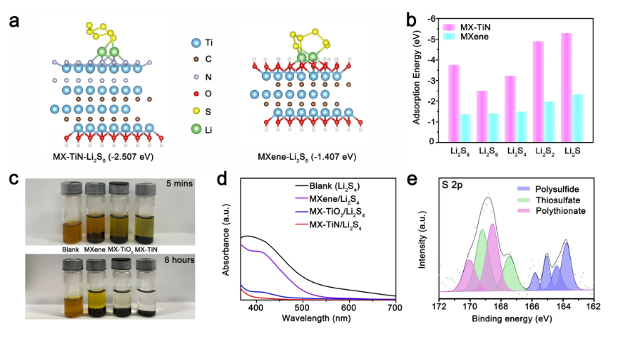 Fig 3. (a) MX-TiN及MXene對Li?S?的優化吸附模型;(b)MX-TiN及MXene對不同多硫化鋰的吸附能對比;(c)可視化吸附實驗;(d)吸附后多硫化鋰溶液的紫外可見光吸收譜;(e)MX-TiN吸附多硫化鋰后的硫元素XPS譜。