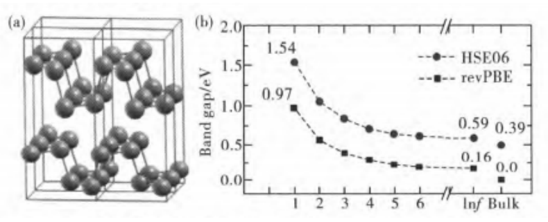 圖3 a) α-砷烯的晶體結構示意圖和(b)第一性原理revPBE、雜化密度泛函HSE06計算得到的α-砷烯帶隙隨層數變化圖。