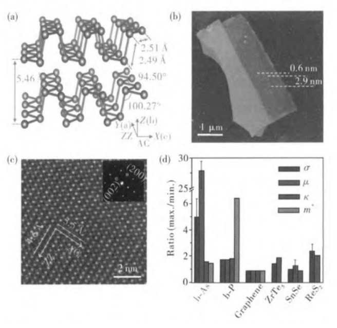 圖4. 層狀黑砷晶格與物性的各向異性:(a)用DFT計算的b—As結構晶格參數的三維表示;(b)機械剝落的b-As的AFM像;(C)具有原子分辨率的b—As的HRTEM圖像;(d)沿b-As和其他二維材料的Ac和zz方向的電導率σ、遷移率μ、熱導率K和有效質量m‘的平面內各向異性的比較。