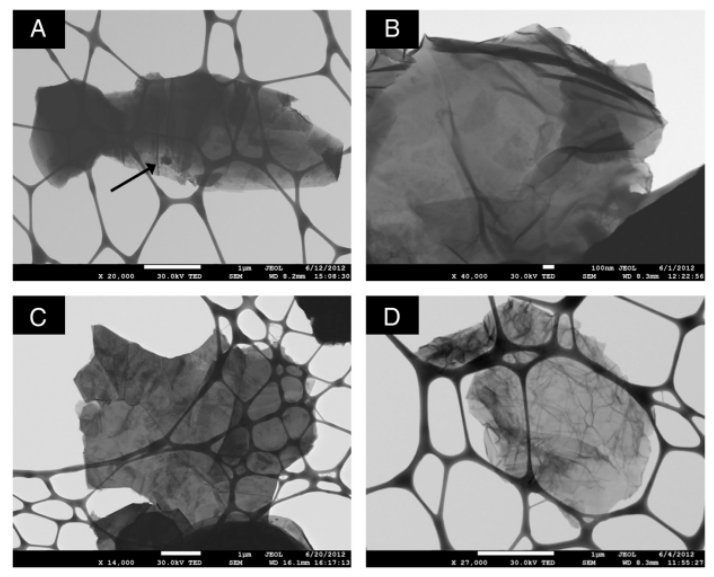 圖2. (A)天然石墨,(B)天然石墨產(chǎn)生的化學(xué)還原石墨烯,(C)合成石墨,以及(D)合成石墨產(chǎn)生的化學(xué)還原石墨烯。