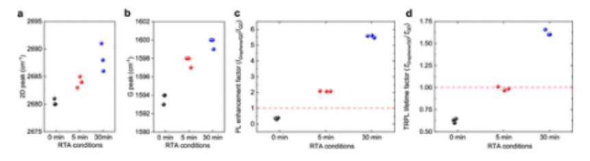 圖5. 石墨烯快速熱退火(RTA)條件,用于石墨烯/量子點混合維度異質結構與10納米GaAs蓋子樣品。RTA溫度為400℃。拉曼測量中石墨烯/二氧化硅/硅(a)2D和(b)G峰的演變。(c)光致發光強度和(d)時間分辨的光致發光壽命增強因子取決于RTA條件。