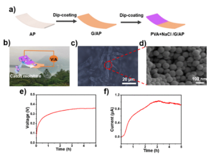 圖4. 器件的制備和表征。(a) PVA + NaCl/G/AP膜的制備示意圖。(b) 濕氣發(fā)電裝置的結(jié)構(gòu)示意圖。(c) PVA + NaCl/G/AP薄膜的光學(xué)圖像。(d) PVA + NaCl/G/AP薄膜的高分辨率SEM圖像。(e) 器件在高濕度(98% RH)下的開路電壓。(f) 器件在高濕度(98%RH)下的短路電流。