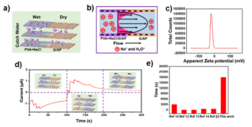 圖6. 器件工作機(jī)制分析。(a) 濕度不對稱結(jié)構(gòu)的示意圖。(b) 基于流動電位原理的裝置示意圖。(c) 石墨烯表面的ζ電位測試。(d) 液滴位置差對裝置短路電流的影響。(e) 我們裝置的穩(wěn)定性與迄今為止報(bào)道的其他碳基濕氣發(fā)電裝置進(jìn)行了比較。