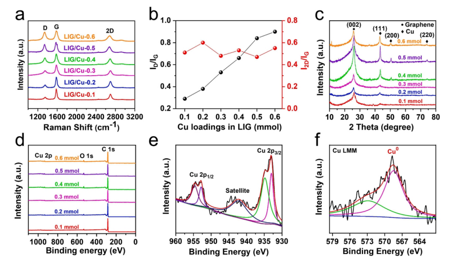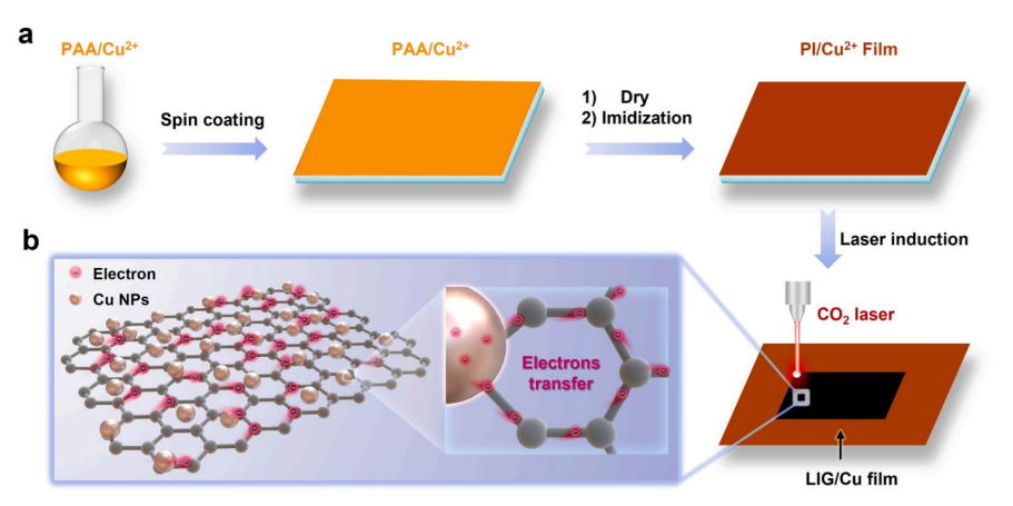 圖1. (a)制備LIG/Cu的合成方案。(b) Cu NPs向石墨烯的電子轉移示意圖。