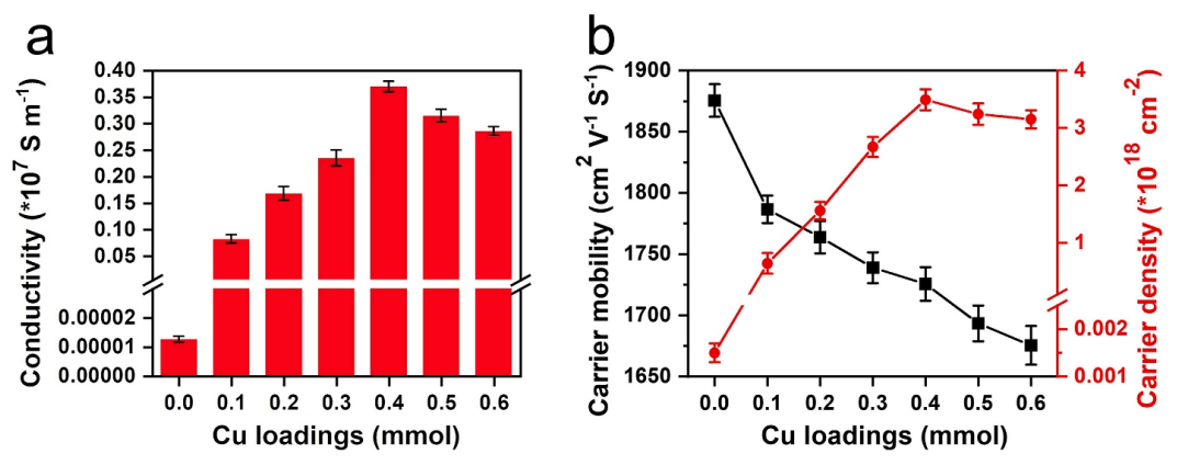 圖2. (a)不同銅負載樣品的電導率。(b)不同樣品載流子遷移率和密度的霍爾效應測量。