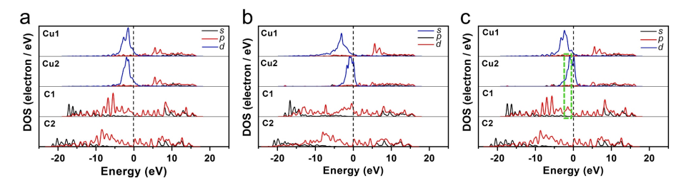 圖7. (a) M1, (b) M2, (e) M3中Cu, C原子的分波態密度(PDOS)比較。Cu l和Cu 2分別表示次外層和最外層的Cu原子。C1和C2表示第一近鄰和第二近鄰的C原子。