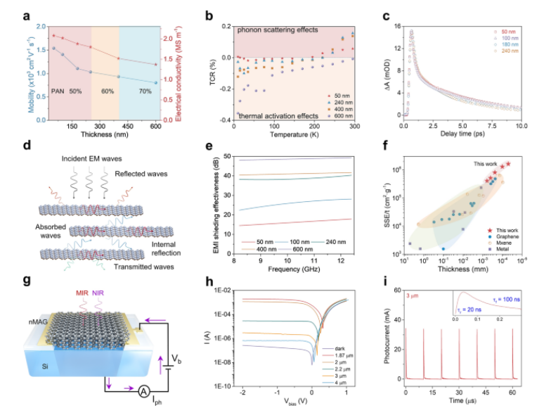 Fig 4. nMAGs 的電氣性能和應用。a nMAG 的載流子遷移率和電導率。b不同厚度的 nMAG 的 TCR。c不同厚度的 nMAG 的瞬態吸收動力學(功率密度,1 mW mm -2;泵浦波長,532 nm;探測波長,1.4μm)。d nMAG 的電磁屏蔽機制示意圖。e 50、100、240、400 和 600 nm 不同厚度的 nMAG 的 EMI SE。f不同 EMI 材料在 X 波段與厚度的 SSE/t 比較。g nMAG/Si 肖特基二極管的示意圖。h I-VnMAG/Si 在不同波長激光照射下的曲線(平均功率密度 40 mW mm. -2)。i 3 µm 波長脈沖激光(200 fs 脈寬)照射下時域 nMAG/Si 的光電流(τ r  = 20 ns 是上升時間,即信號從最低點上升到最高點的時間)。