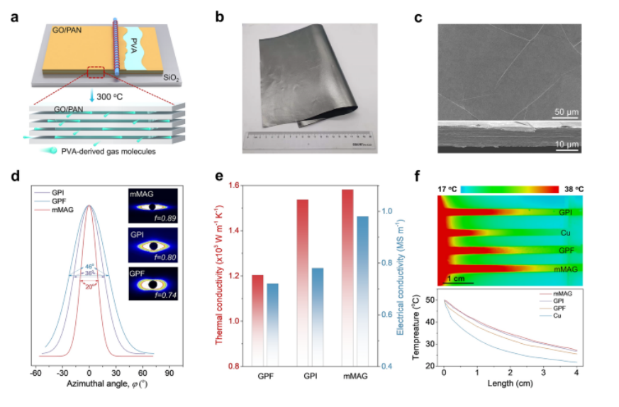 Fig 5.由 200 納米厚的 nMAG 組裝而成的 10 微米厚的 mMAG 的熱特性。a GO/PAN 薄膜(每層 400 nm)和 PVA(每層 5-20 nm)逐層組裝的示意圖,經過 3,000℃熱處理后形成 10μm 厚的 mMAG(上)以及預氧化過程中PVA分解示意圖(下);黃色和灰色薄膜為預氧化前后的PAN/GO薄膜,綠色為PVA。b mMAG 的光學圖像。c mMAG 表面和橫截面的 SEM 圖像,顯示微褶皺的超低密度。d SAXS 散射圖案的方位角 (φ) 圖以及 mMAG、GPI 和 GPF 薄膜的相應二維 SAXS 圖案(插圖)。電子mMAG、GPI 和 GPF 薄膜的熱導率和電導率。f 10μm 厚的 GPI、Cu、GPF 和 mMAG 的紅外熱圖像和相應的溫度曲線,一側緊貼恒溫加熱器。