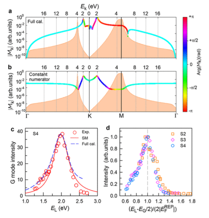 Fig 4. M???(M???=????????????) 在EL=2 eV的高對稱線 Γ – K – M – Γ 中的絕對值(對數刻度)和相位(顏色編碼),包括Mk (a)(完全校準),并將偶極子和 EPME 設置為常數 (b)(常數分子),兩者都用于 γ= 0.225 eV 的恒定展寬。陰影區域表示Ek處的聯合狀態密度值。(c) 實驗 REP(空心圓)和理論 REP 由從頭計算(完整計算,虛線)和 SM(實線)。(d) 作為 ( E L – EG /2)/2|EFREP|函數的 S2–S4 的重新縮放實驗 REP。