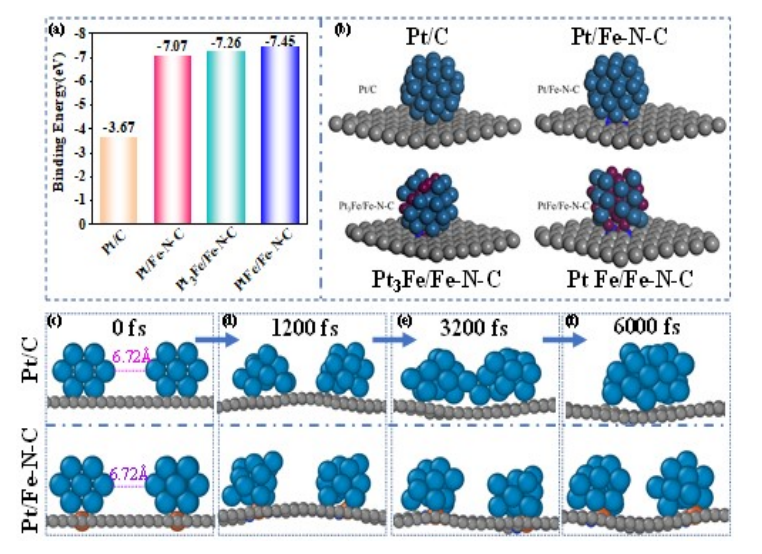 Fig 5. 負載在碳基板上的鉑基納米粒子的耐久性計算結果。(a) Pt/C、Pt/Fe-N-C、Pt3Fe/Fe-N-C 和 Pt Fe/Fe-N-C 的結合能和 (b) 相應的優化結構。 (c-f) 從頭算分子動力學結果顯示在 300 K 下負載在碳基板上的兩個 Pt