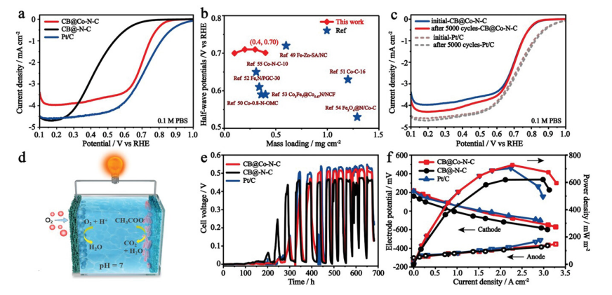 Fig 5. (a)在O2飽和的0.1 M PBS(pH=7.0)中,CB@Co-N-C、CB@N-C和Pt/C在RRDE上的LSV曲線。其中,轉(zhuǎn)速均為1600 rpm,CB@Co-N-C和CB@N-C的催化劑負(fù)載量為400μg/cm2。(b)中性介質(zhì)中,CB@Co-N-C和文獻(xiàn)中報(bào)道的其它催化劑的半波電位比較。(c)在0.6-1.1 V,掃速為100 mV/s時(shí),CB@Co-N-C和Pt/C在5000圈循環(huán)前后的穩(wěn)定性比較。(d)MFC示意圖。CB@Co-N-C、CB@N-C和Pt/C分別作為陰極電催化劑,組裝MFC的(e)電壓輸出曲線和(f)功率密度曲線和電極電勢。
