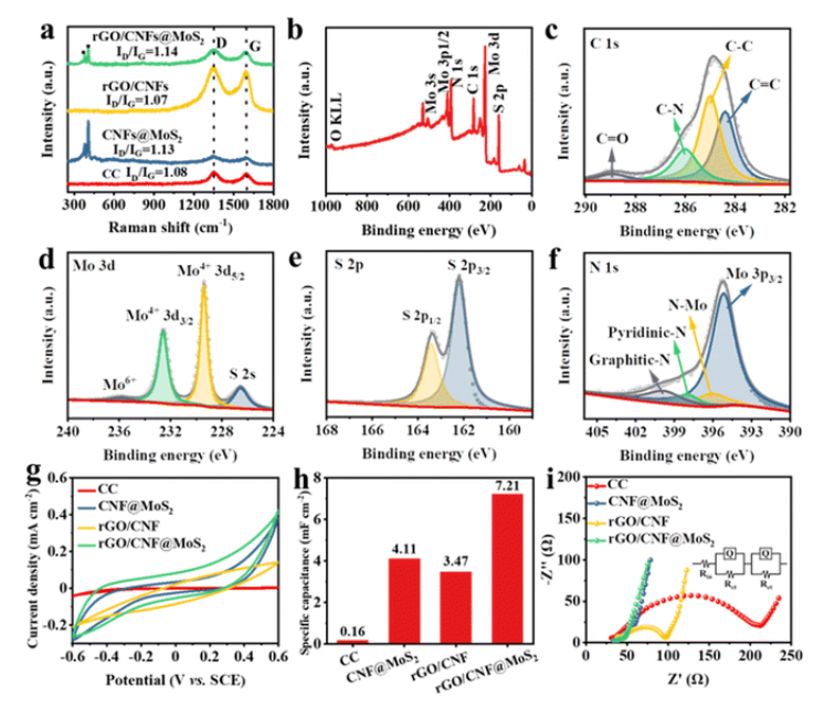 2 電催化劑的 XPS 概覽光譜和 (c) C 1s、(d) Mo 3d、(e) S 2p 和 (f) N 1s 的相應解卷積峰。所有準備好的陽極的電化學測量:(g)CV 曲線,(h)比電容值,(i)奈奎斯特曲線(插圖是等效電路)。