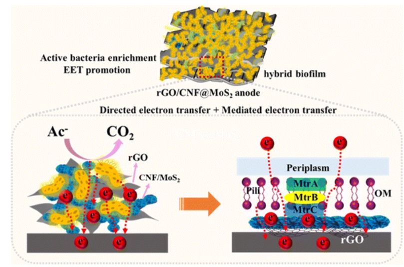 2納米花 (rGO/CNF@MoS2) 的生長。生成的互連 rGO/CNF@MoS2 支架提供了明顯更粗糙的表面、較大的電化學表面積、良好的導電性和豐富的電活性位點,這有利于生物膜的粘附和活力,并提高了 EET 效率。因此,配備 rGO/CNF@MoS2 改性陽極的 MFC 在 8220 mA m