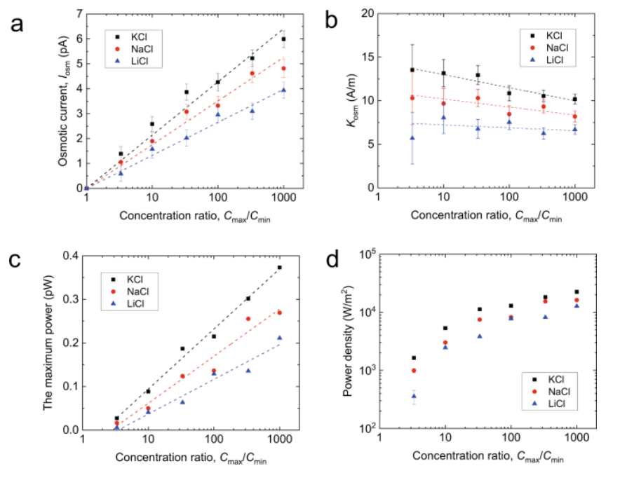 Fig 3. (a)具有 KCl(黑色)、NaCl(紅色)和 LiCl(藍色)的單個 CNT 納米通道的滲透流與濃度比。誤差棒源自實驗測量的滲透電流的標準偏差。(b)三種溶液的傳輸系數K osm作為濃度比的函數。(c、d)相應產生的滲透凈功率 ( c ) 和單孔功率密度 ( d ) 與濃度比。