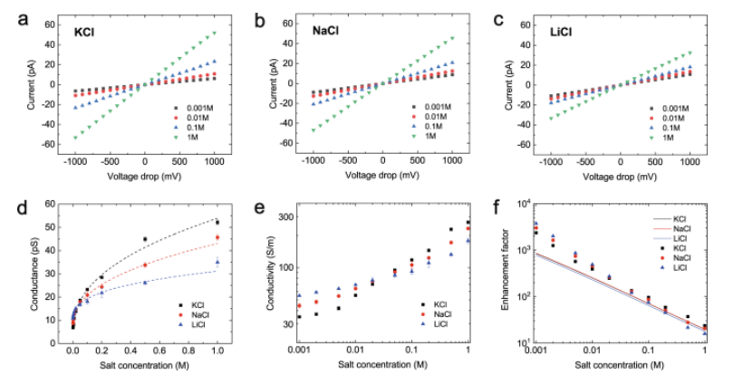Fig 4. 對于單個碳納米管納米通道,(a – c)顯示了在不同溶液濃度下用 ( a ) KCl、( b ) NaCl 和 ( c ) LiCl 記錄的I-V曲線。(d)納米通道離子電導率、€電導率和(f)電導率增強作為 KCl、NaCl 和 LiCl 溶液濃度的函數。
