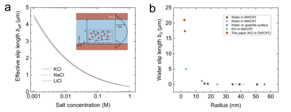 2 ) 用于輸送 KCl、NaCl 和 LiCl 溶液通過管道。進一步的實驗表明,這種非凡的性能源于超高的滑移長度(高達幾微米)。我們的結果表明,碳納米管不僅是超快傳輸的良好候選者,而且是鹽度梯度下滲透能量收集的良好候選者。