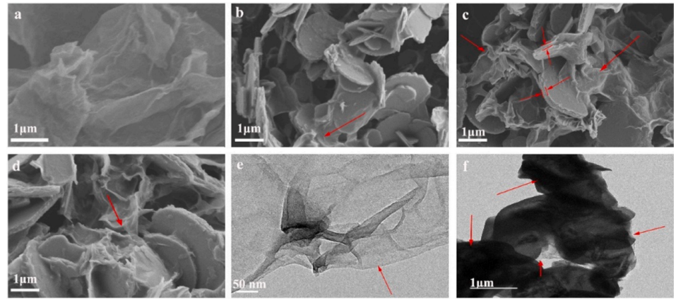 圖2. (a)GO, (b) RGO-LDH (1:1), (c) RGO-LDH (2:1), (d) RGO-LDH (3:1)的SEM圖像;(e) GO, (f) RGO-LDH(2:1)的TEM圖像。