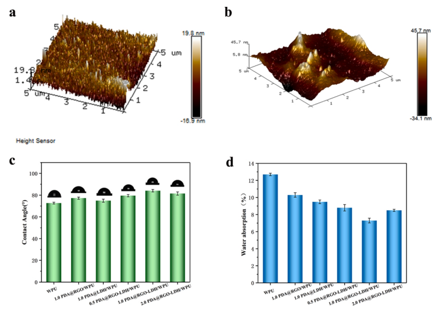 圖5. AFM圖像:(a) WPU膜,(b) 1.0 PDA@RGO-LDH/WPU復合膜;WPU膜和復合膜的(c)水接觸角和(d) 吸水率。