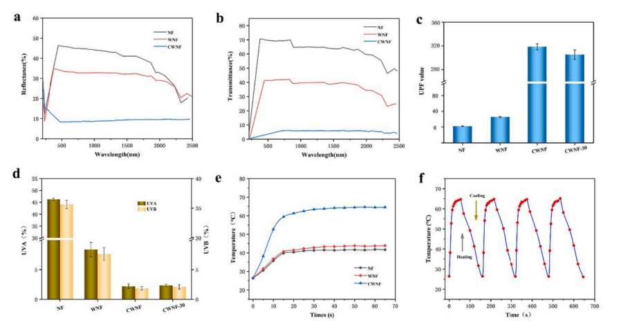 圖8. NF、WNF和CWNF的(a)反射率曲線、(b)透射率曲線、(c) UPF值、(d) UVA和UVB透射率值及(e)表面溫度曲線 ;(f) CWNF循環加熱-冷卻過程溫度曲線。