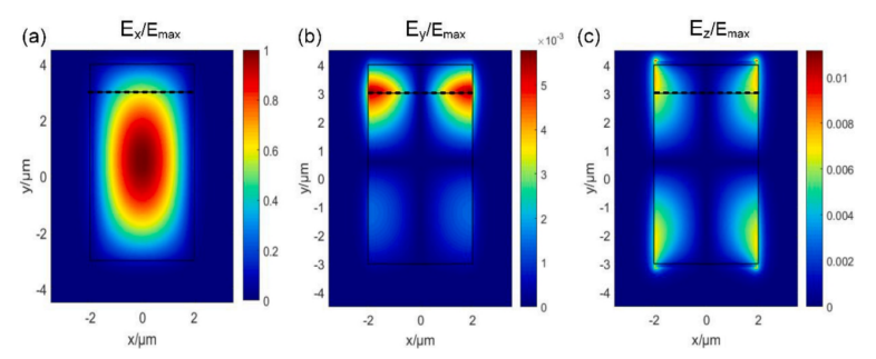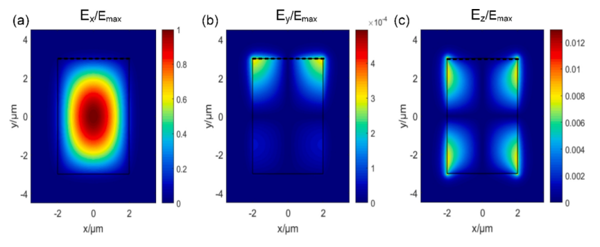 圖4. PGSHW的準-TE模態分布。(a)電場x分量。(b)電場y分量。(c)電場z分量。