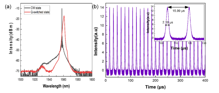 圖8. (a)使用P-GSHW的激光腔調q脈沖的時域序列。插圖顯示了單個脈沖的波形。(b)調q鎖模脈沖。插圖顯示了單個調q鎖模脈沖包絡的細節。