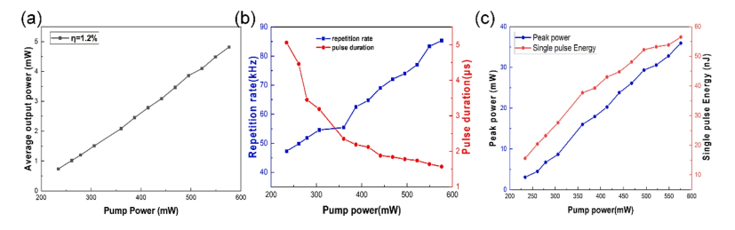 圖7. (a)平均輸出功率與泵浦功率之比。使用單層石墨烯的實驗數據用黑色實心方塊表示。(b)脈沖寬度和脈沖重復率隨泵浦功率增加時的變化。(c)脈沖能量和脈沖峰值功率與泵浦功率的關系。