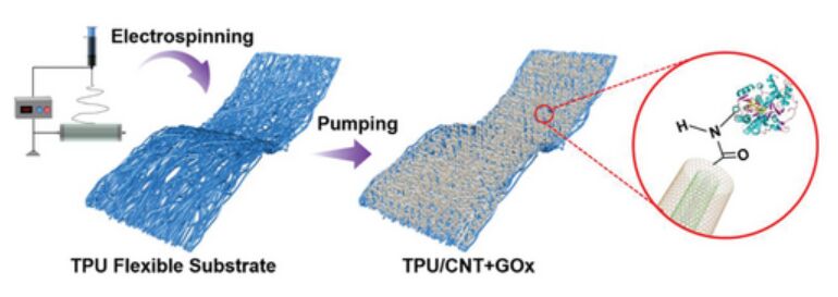 Fig 1. TPU/CNT+GOx 詳細合成程序示意圖。圓圈突出了GOx通過官能團的固定化。