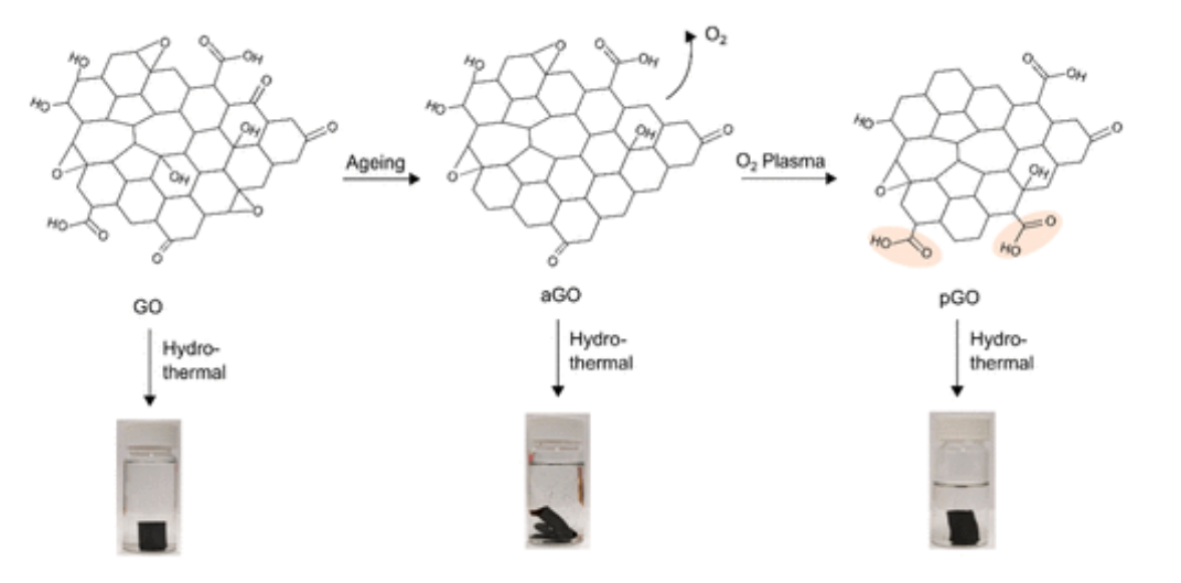 從氧化石墨烯前體生產高度穩定、無缺陷和導電的3D石墨烯結構具有挑戰性。這是因為氧化石墨烯是一種亞穩態材料,其結構和化學性質因老化而演變。老化改變了附著在氧化石墨烯上的氧官能團的相對組成,并對還原氧化石墨烯的制造和性能產生負面影響。在這里,我們報道了一種使用氧等離子體處理逆轉氧化石墨烯前體老化的通用策略。這種處理降低了氧化石墨烯薄片的尺寸,并恢復了負ζ電位和水中懸浮液的穩定性,從而能夠使用水熱合成制備緊湊且機械穩定的石墨烯氣凝膠。此外,我們采用高溫退火來去除還原氧化石墨烯中的含氧官能團并修復晶格缺陷。該方法允許獲得具有390S/m的電導率和低缺陷密度的高導電石墨烯氣凝膠。使用X射線光電子和拉曼光譜對羧基、羥基、環氧化物和酮氧物種的作用進行了徹底的研究。我們的研究為氧化石墨烯從室溫到2700°C的老化和熱還原過程中發生的化學轉變提供了獨特的見解。