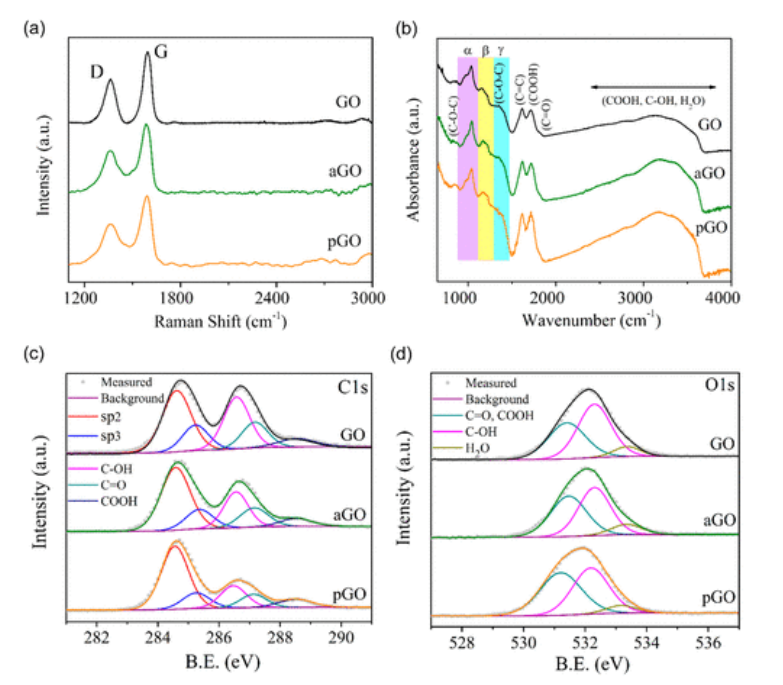 圖2:(a) GO、aGO和pGO的拉曼光譜、(b)FTIR和XPS(c)C1s和(d)O1s光譜(GO:新的氧化石墨烯;aGO:老化的氧化石墨;pGO:等離子體處理的老化氧化石墨烯)。