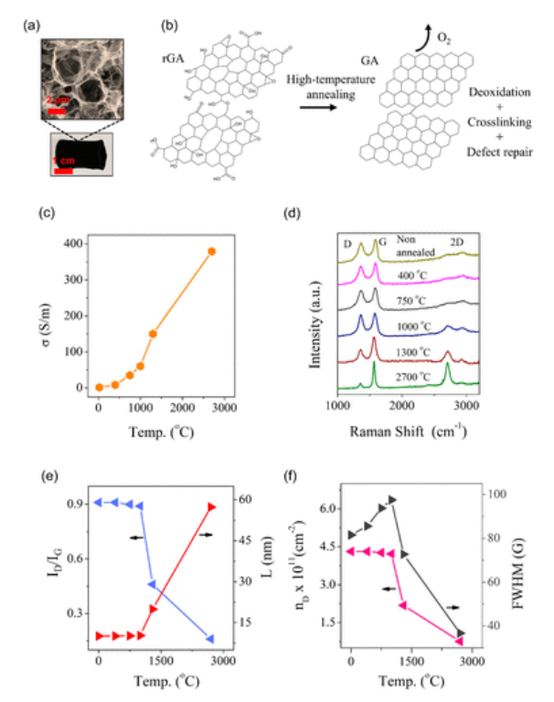圖4.(a) 石墨烯氣凝膠的SEM和光學圖像,以及(b)高溫退火引起的化學變化示意圖,高溫退火導致氧官能團和結構缺陷的去除以及共價交聯。(c) 石墨烯氣凝膠的電導率作為退火溫度的函數,使用四探針方法。(d) 不同溫度退火GA的拉曼光譜。(e) I