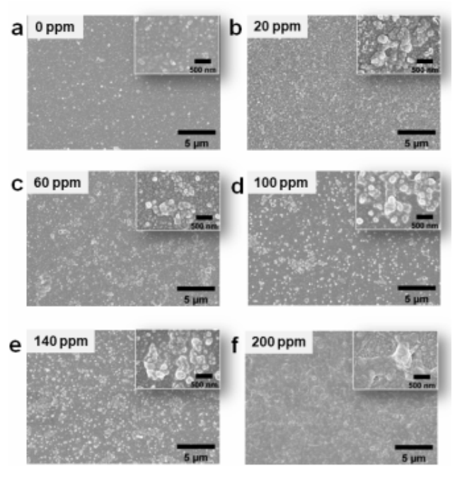 圖3. MXene添加量為0-200 ppm時MXene-聚酰胺膜的表面形貌。