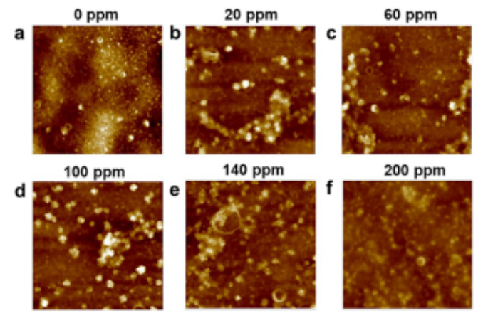 圖4. 添加0-200ppm MXene時,MXene-聚酰胺膜的AFM形貌。