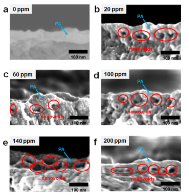 圖10. 當加入0、100、200 ppm MXene時,無SDS表面活性劑的PA層中出現(xiàn)納米通道。