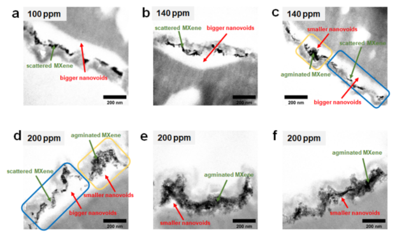 圖6. (a−f)不同添加量的MXene膜的不同尺寸的TEM圖。