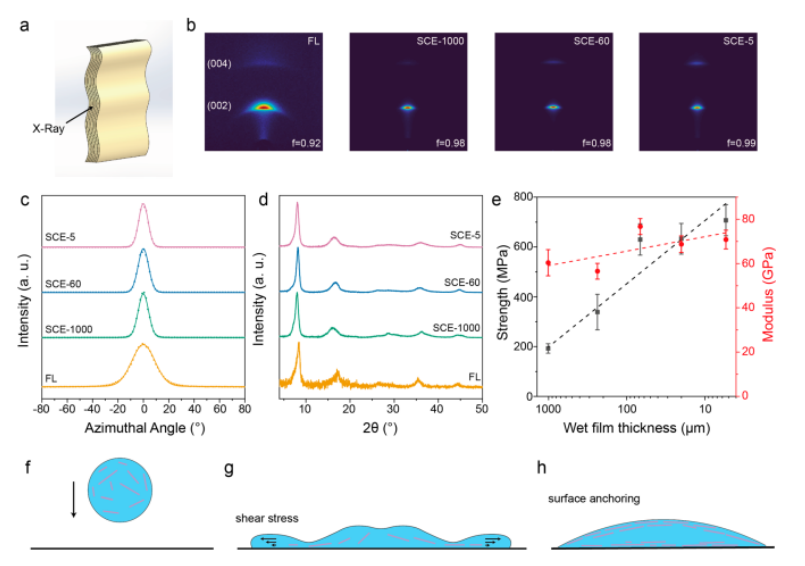 圖3. (a) x射線入射方向示意圖。(b, c) FL, SCE- 1000, SCE-60和SCE-5的散射模式(b)和相應的方位圖(c)。(d)薄膜的XRD圖案。e) SCE MXene薄膜的楊氏模量和拉伸強度的比較。(f, g)說明落差影響和擴散的過程。(h)表面錨定效應說明。