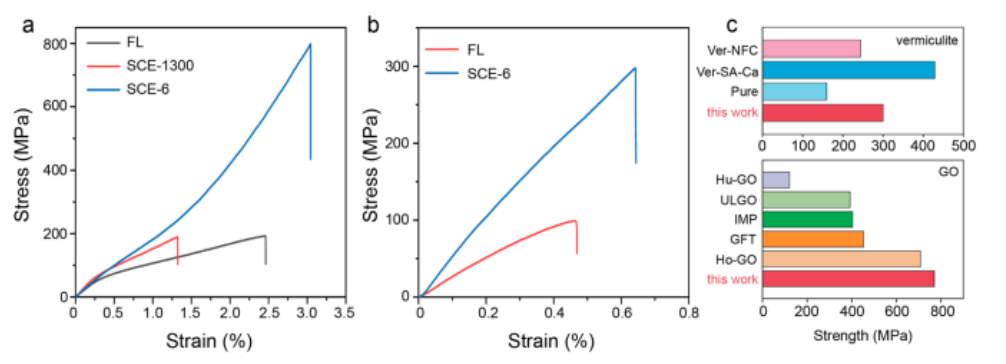 圖5. (a, b)氧化石墨烯(a)和蛭石(b)薄膜的應力-應變曲線。(c) SCE薄膜的抗拉強度與以往報道的比較。