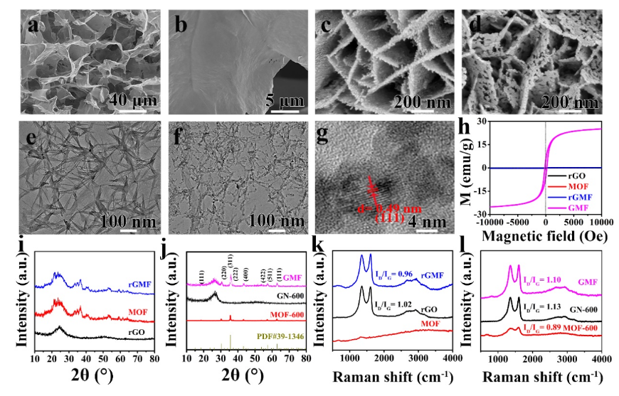 圖2. 泡沫的SEM圖像:(a, b)rGO泡沫;(c)rGMF; (d)GMF; TEM圖像:(e)rGMF;(f, g)GMF; 相關樣品的(h)磁滯回線,(i, j)XRD圖譜和(k, l)拉曼光譜圖。
