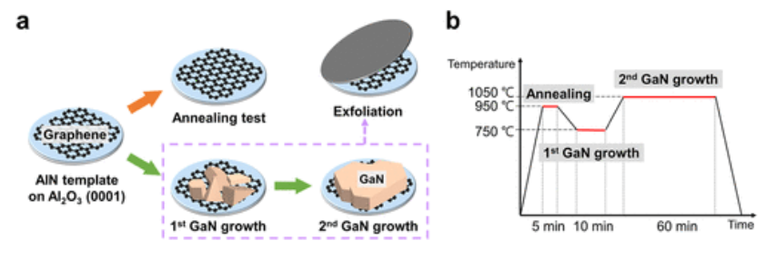 圖1.GaN遠程異質外延和剝離。(a) AlN模板上GaN遠程異質外延的示意圖,包括剝離和石墨烯熱退火測試。(b) 與溫度相關的GaN生長過程圖。