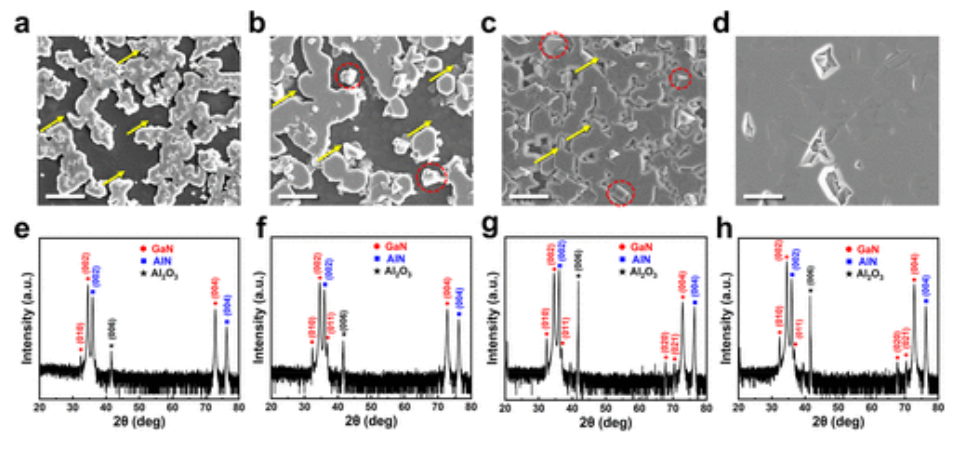 圖3.石墨烯/AlN上生長的GaN的檢查。第一次生長GaN(a,e)、第二次生長5分鐘(b,f)、第三次生長10分鐘(c,g)和第二次增長60分鐘(d,h)后的頂視圖SEM圖像和XRD 2-θ掃描。紅色虛線圓圈是隨機取向的GaN晶粒,黃色箭頭是平面內排列。所有比例尺均為4μm。