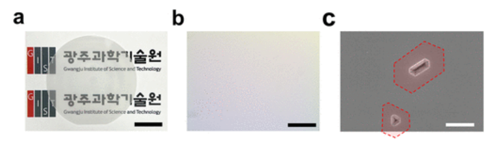 圖8.AlN模板的圖像。(a) 2英寸的照片。石墨烯轉移前的AlN模板。比例尺,1.5厘米。GIST允許在背景上使用GIST標志。(b) 同一模板中心區域的顯微鏡圖像。比例尺,40μm。(c)相同模板的更高量級SEM圖像。比例尺相同,5納米。紅色填充的虛線區域是石墨烯預計在第二GaN生長步驟期間被損壞的地方。受損區域可能比虛線區域還要大。