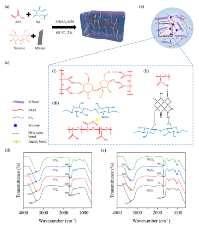圖1. (a)制備PGMS水凝膠的示意圖。(b)水凝膠內部結構示意圖。(c)水凝膠網絡中的分子相互作用示意圖。(d)不同SA含量水凝膠的FTIR光譜。(e)不同蔗糖含量水凝膠的FTIR光譜。