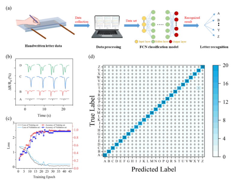 圖6 (a)用于字母識別的PGMS水凝膠傳感器示意圖。(b) PGMS水凝膠對四字母書寫的響應。(c)損失函數和準確度隨訓練周期的變化圖。(d)字母識別結果混淆矩陣。