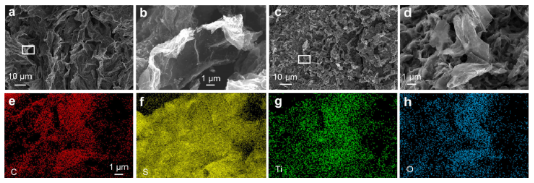 圖2. a、b GM氣凝膠低倍和高倍SEM圖像;c、d GM/S氣凝膠低倍和高倍SEM圖像;GM/S氣凝膠中e C、f S、g Ti和h O元素分布的能譜圖。