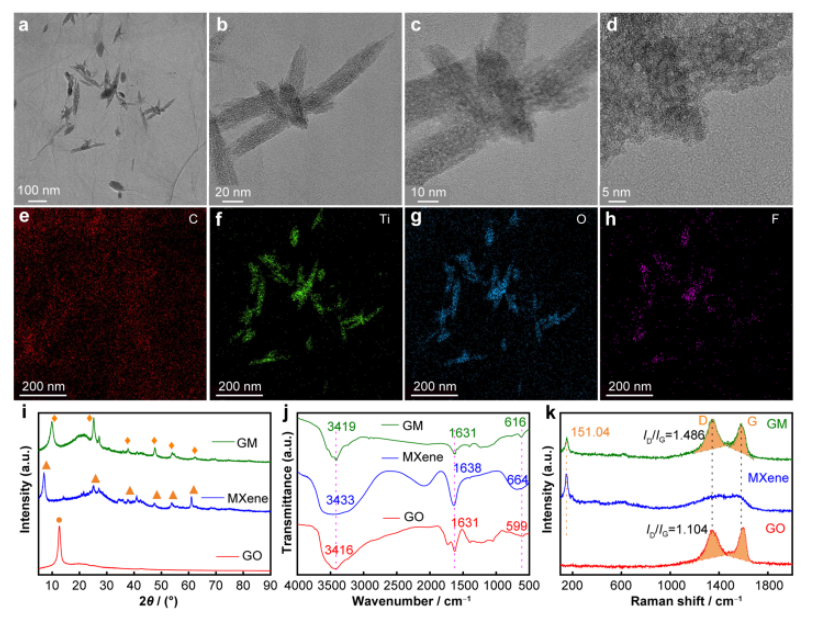 圖3. 不同放大倍率GM的a-d TEM和HRTEM圖像;E-h對應的元素映射圖像a;i GO, MXene和GM氣凝膠的XRD圖譜,j FTIR光譜,k拉曼光譜。