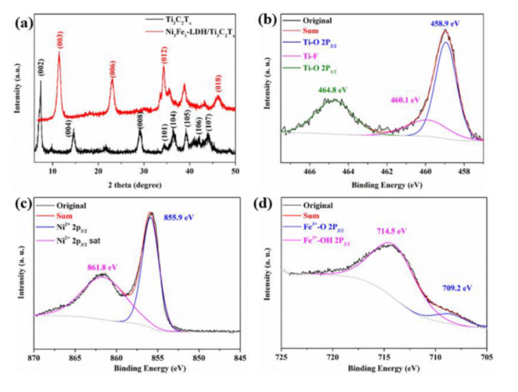 圖2. (a) SEM圖,(b、c) TEM圖,(d) Ni3Fe1-LDH/Ti3C2Tx元素映射結果。
