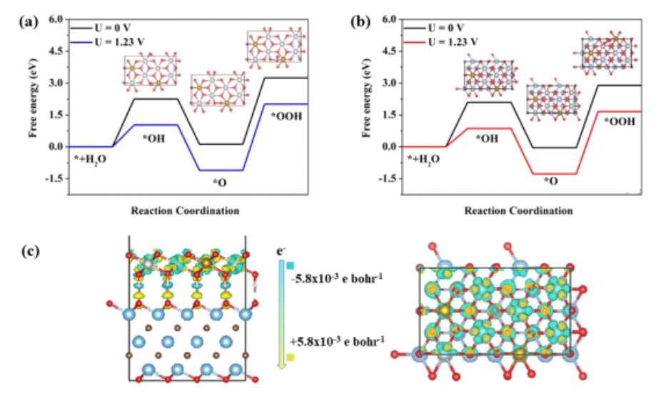 圖4. 自由能圖和相應的中間物質對氧的析出反應的機理分析。