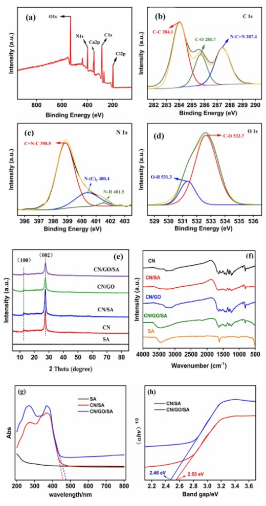 圖2. CN/GO/SA的XPS光譜(a)和C1s (b)、N1s (c)和O1s (d)高分辨光譜。催化劑的XRD譜圖(e)。催化劑的FT-IR光譜。(f). CN/GO/SA的UV-Vis DRS漫反射光譜(g)和Tauc圖(h)。