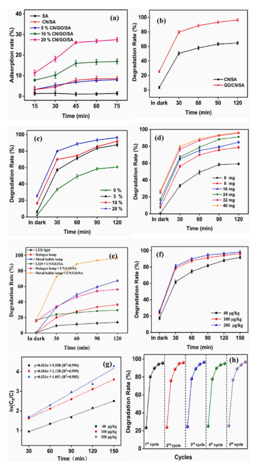 1的影響。(a)催化劑的吸附能力。(b)不同類型的催化劑。(c) CN/GO在CN/GO/SA催化劑中的摻雜比例。(d)催化劑用量和輻照時間。(e)光源。(f) AFB
