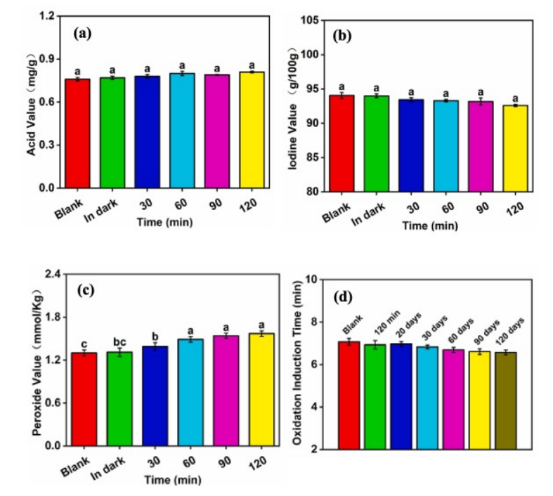 圖5. 光催化過程中花生油理化指標的變化。(a)酸值。(b)波定值。(c)過氧化值。(d)氧化穩定性。